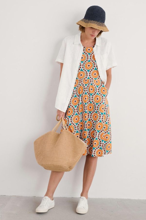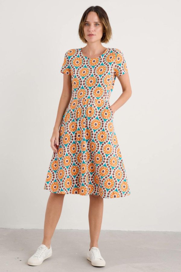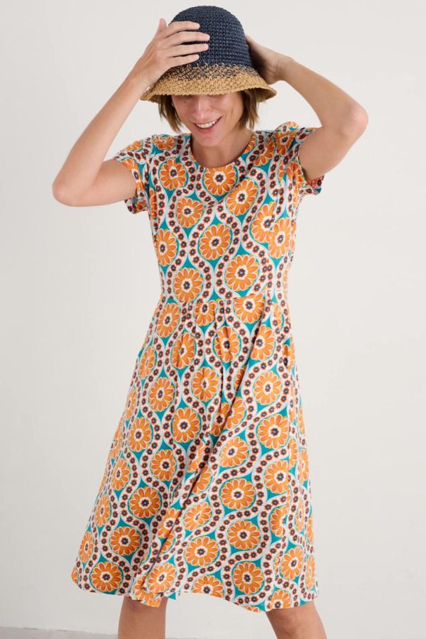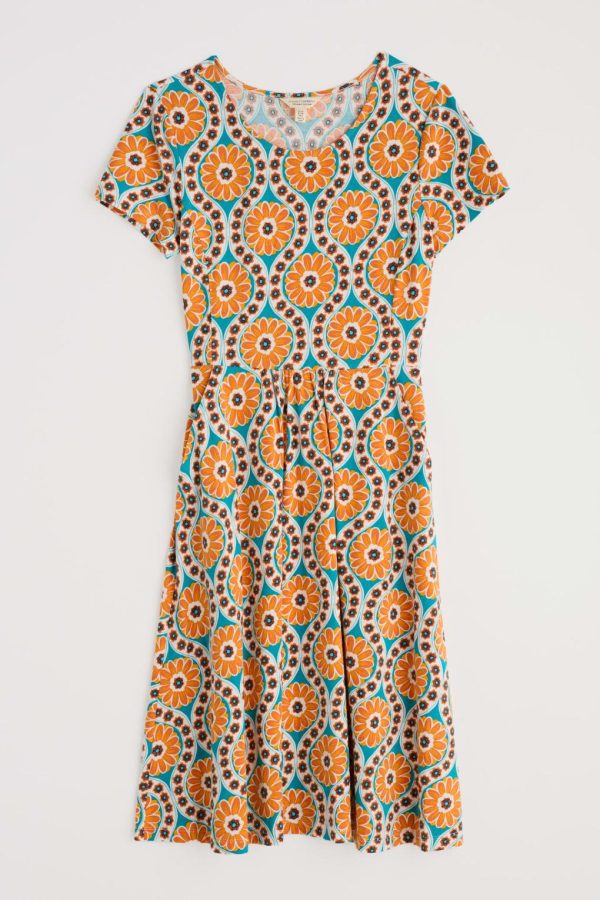 Made from soft and breathable organic cotton jersey with a touch of stretch for extra comfort. Falling just below the knee, it has an easy to wear, feminine fit and flare shape and is finished with a boat neck and gentle gathers at the waistband. We love organic cotton, because it’s grown without harmful fertilisers and pesticides, supporting wildlife, soil quality and the people who grow and process the cotton.