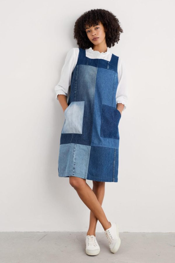 The knee-length pinafore features generous patch pockets and a classic square neckline, in a relaxed fit for easy layering. Each individual dress features its own unique pattern of denim washes, tones and textures. An exclusive piece from an innovative collaboration, with no two dresses the same.