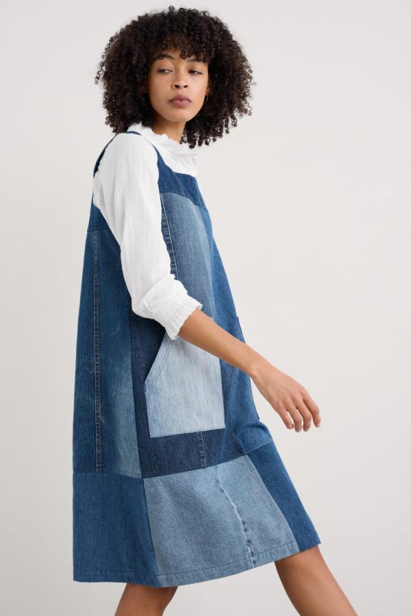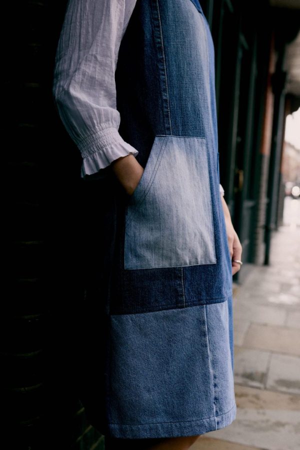 A one-of-a-kind, limited-edition pinafore dress, made in collaboration with Beyond Retro. This exclusive collection repurposes denim, reducing textile waste within the clothing industry while creating stand-alone pieces. Our Calican Pinafore is crafted from a patchwork of repurposed denim panels, each one individually selected, matched and assembled.