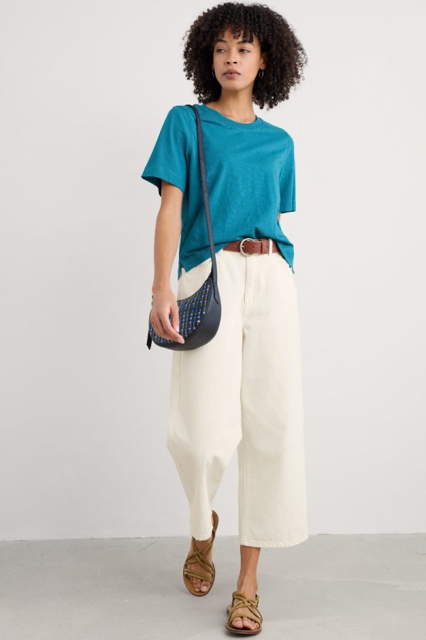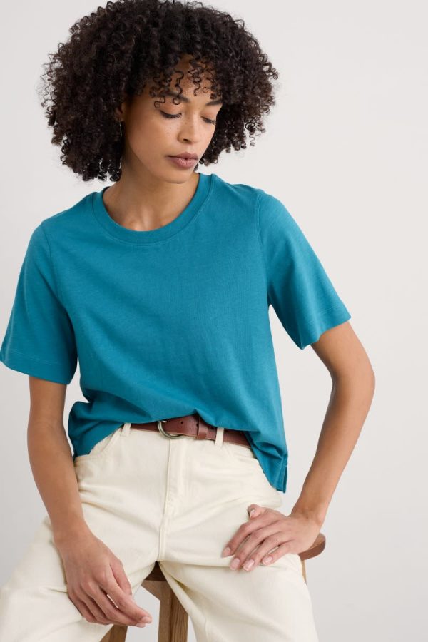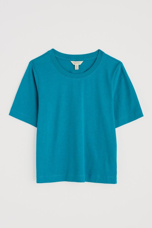 We’ve given the Copseland T-shirt a boxy fit and comfortable ribbed neckline. Made from soft organic cotton jersey in beautiful Cornish colours, it’s a wardrobe staple you’ll find ways to style every day. Designed with a slightly shorter length to look great with high waisted skirts, jeans and trousers.