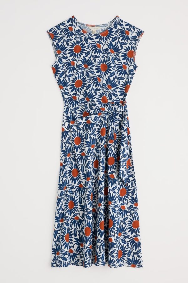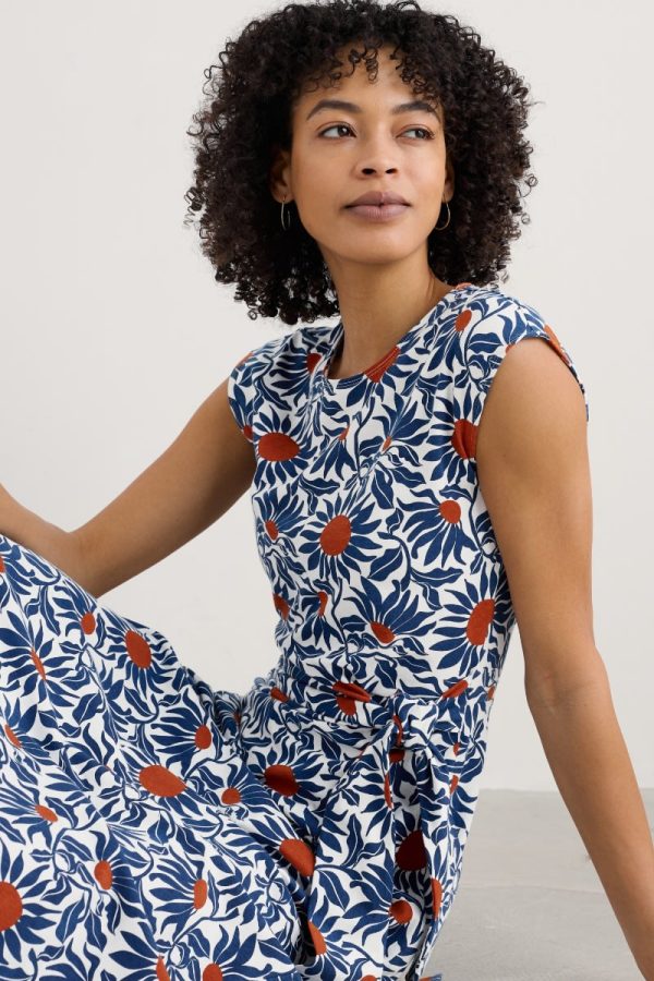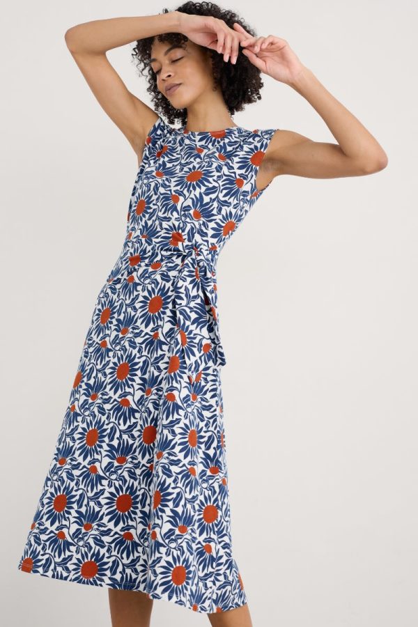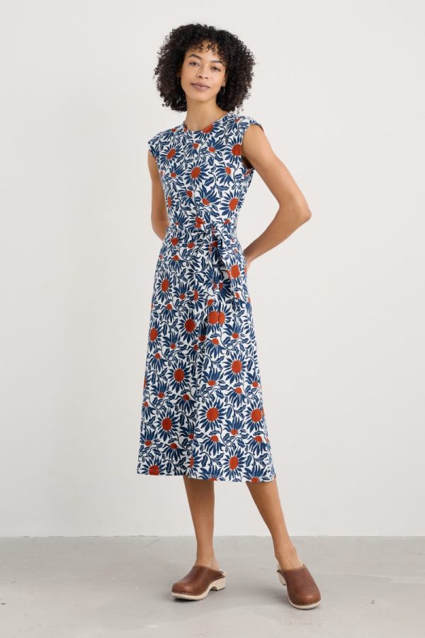 A pretty tie detail emphasises the gently waisted shape of our Fettling midi dress. It’s made from soft organic cotton-rich jersey, with added stretch for comfort and fit. The simple crew neck and cap sleeves make it a versatile piece for everyday elegance.