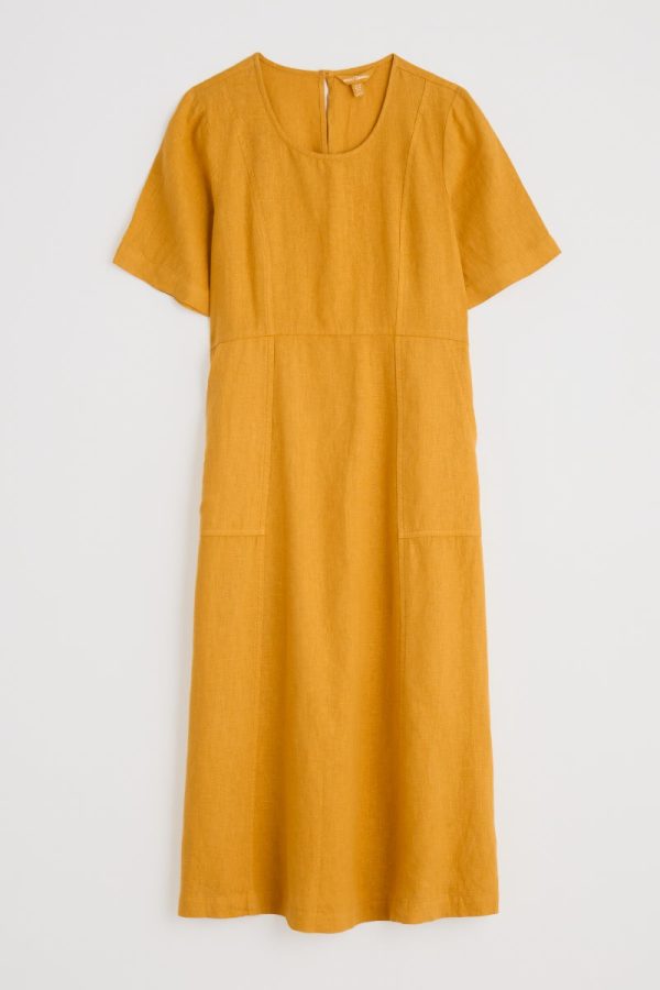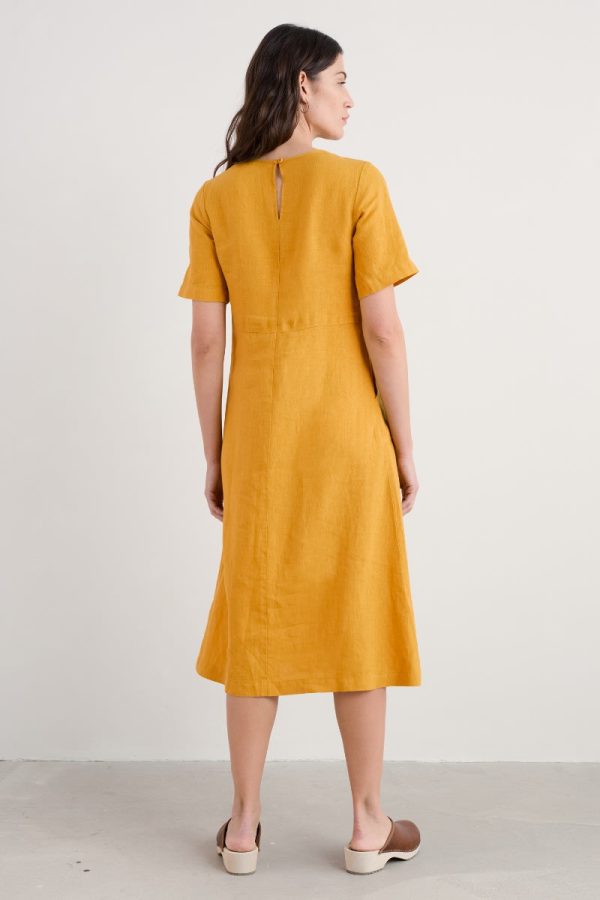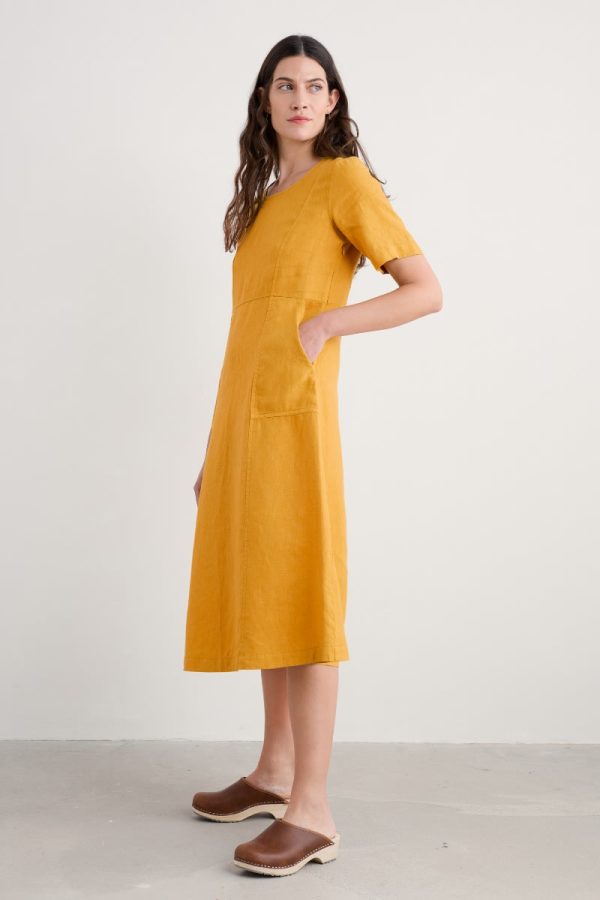A versatile half-sleeve linen midi dress, with a curved waist and front seam details, generous patch pockets and classic scoop neck. Dress up or down; a comfortable, breathable, timeless piece you’ll find so many ways to wear.