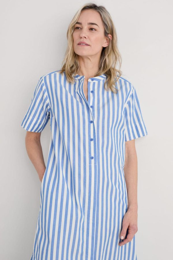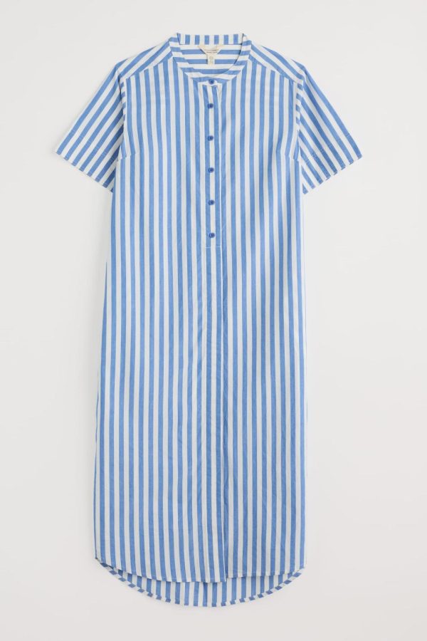 Our joyful new shirt dress is made has vibrant yarn-dyed seaside stripes. The soft organic cotton midi has a relaxed fit through the body, with a slight flare towards the curved high-low hem. The sleeves are a cool half length, and we’ve slipped in a pair of discreet side seam pockets. A grandad collar and half-button placket add classic shirting touches to this easy-wearing piece, which can also be teamed with trousers as an oversized top.