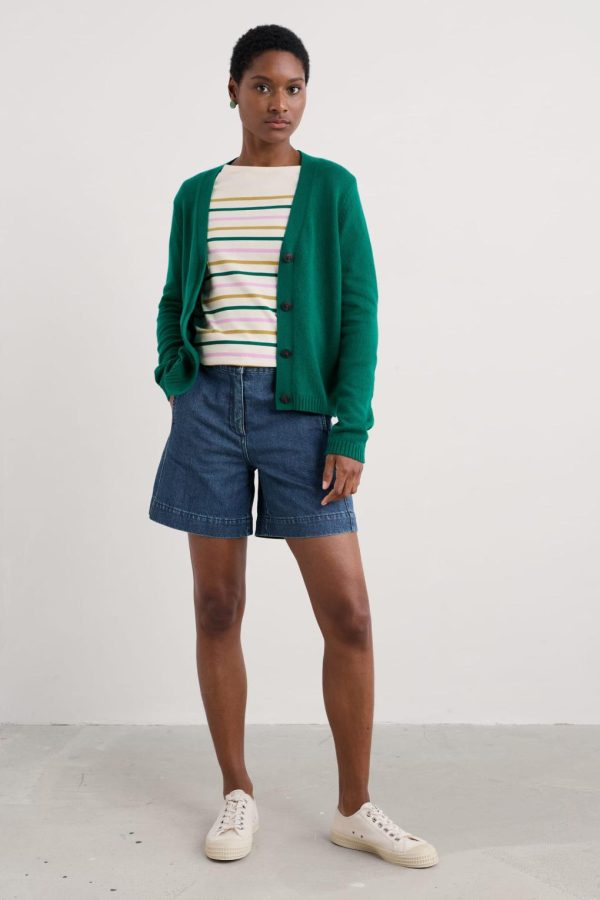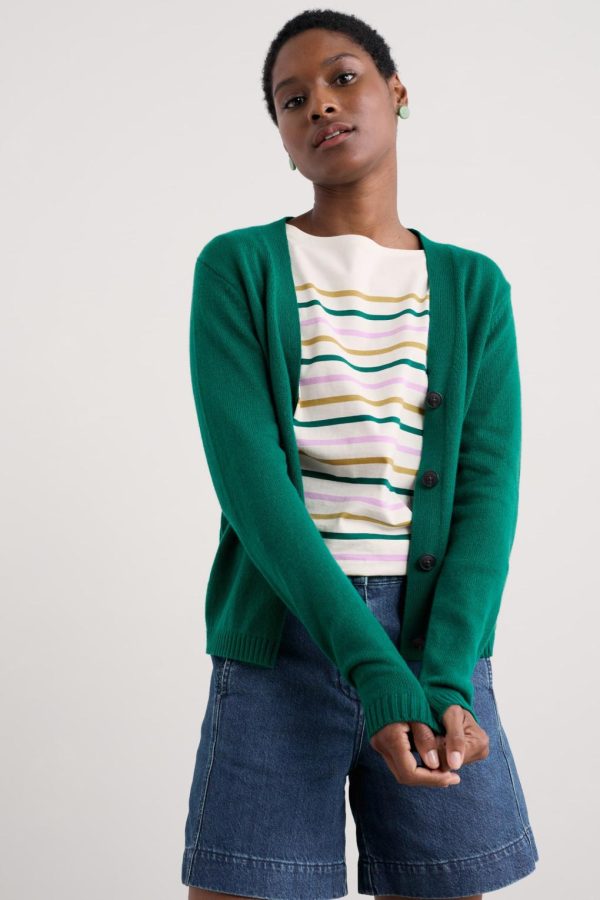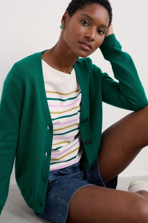Perfect worn over your summer dress, our Kelyn Cardigan is knitted in a smooth jersey stitch, from a soft blend that contains Merino wool. The V-neck cardigan has a neat fit and slim long sleeves, and fastens with a row of mock horn buttons. Classic ribbed trims at the cuffs and hem add the finishing detail.