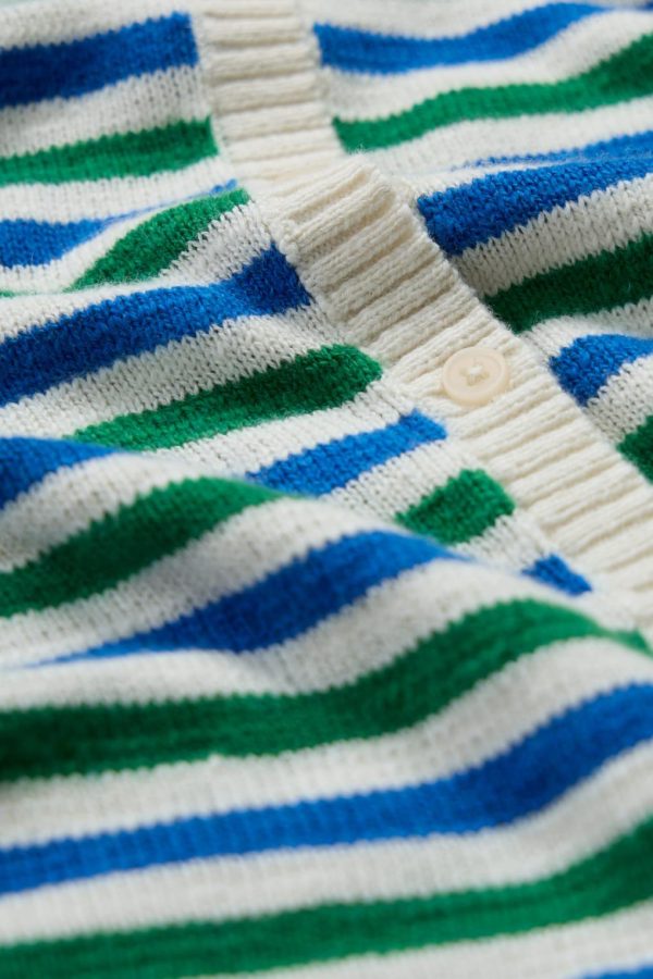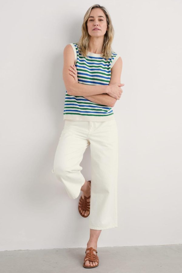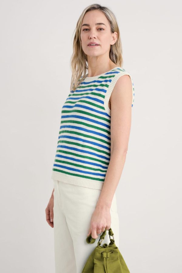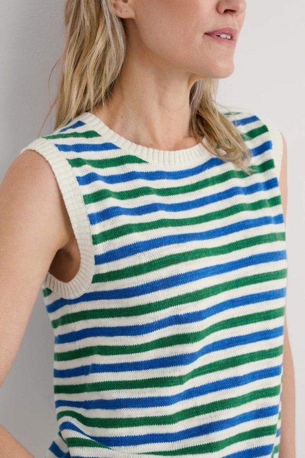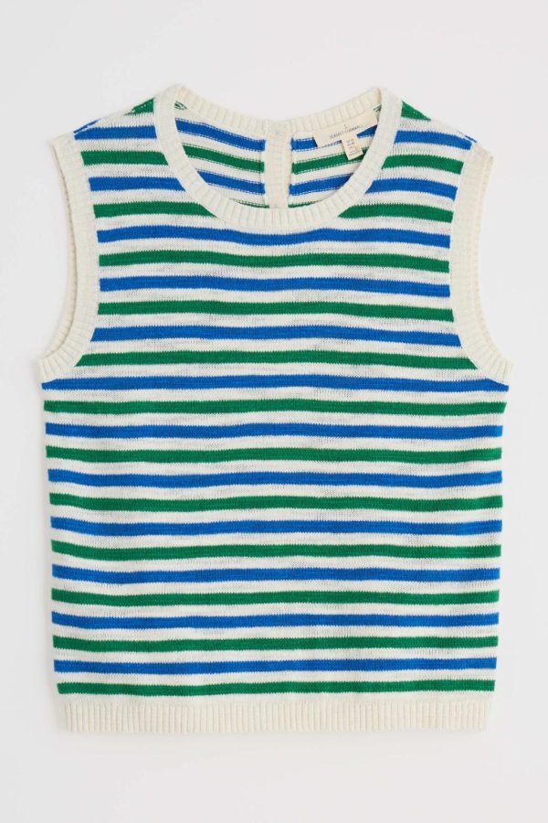 A relaxed-fit vest for warmer days, knitted from cool and comfortable cotton-linen yarn. The lightweight knit is striped with vibrant Cornish colours, yarn-dyed for extra depth and richness. At the back, a full-length placket with functional buttons adds a distinctive extra detail. We’ve finished this lovely piece with classic ribbed trims at the boat neck, arm holes and hem. A new vest inspired by our much-loved Knavock jumper.