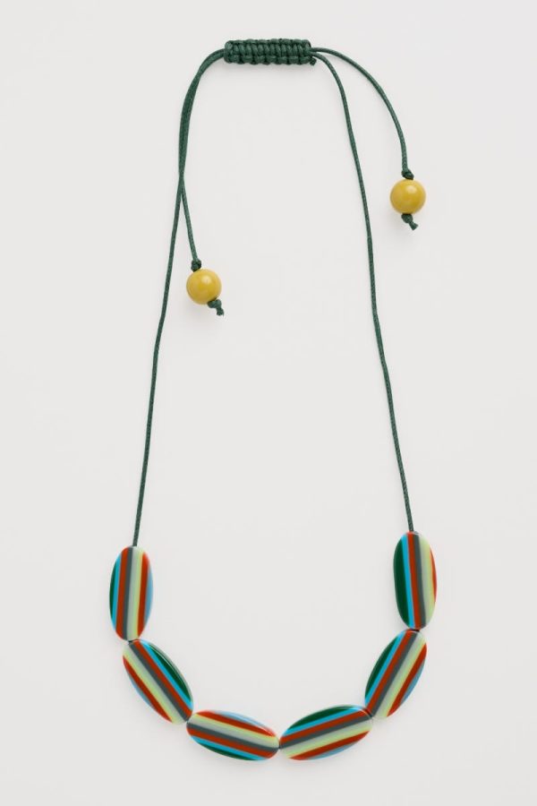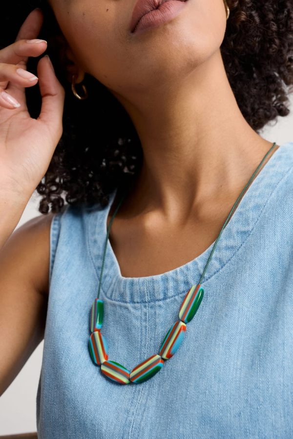 The appealing candy stripes of our Limonite necklace celebrate bright seaside style. This season’s vibrant palette comes together in these large, oval-shaped beads, which are crafted from smooth resin that makes the colours glow. Its slightly shorter length of 70cm can be adjusted to best suit your neckline, and the cotton cord is finished at the back with a pair of pretty beads.