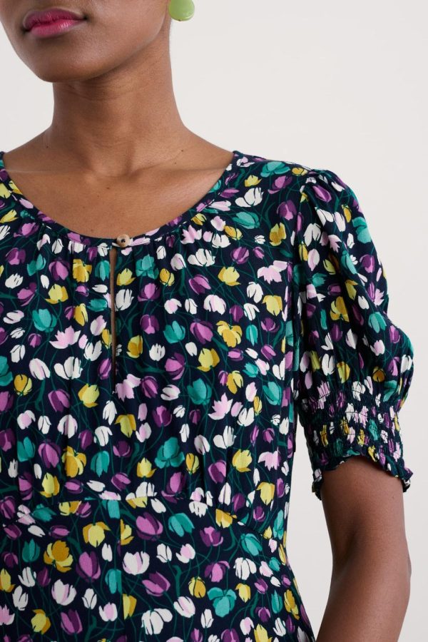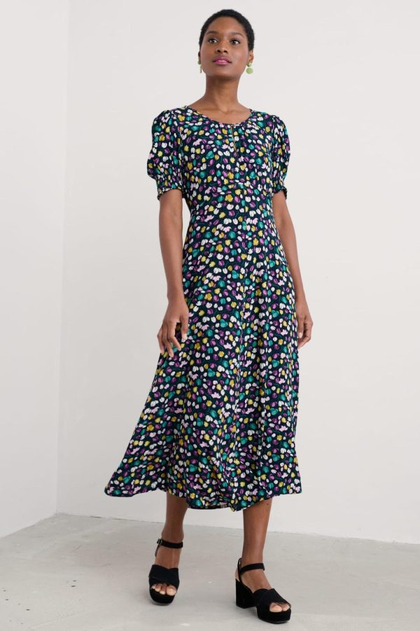 A romantic, vintage-inspired dress with a skimming Empire Line fit and shirring at the cuffs for a subtle blouson sleeve. The simple scoop neckline has a deep notch detail with a button fastening.