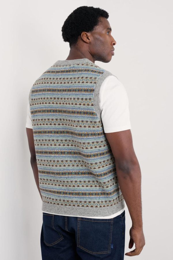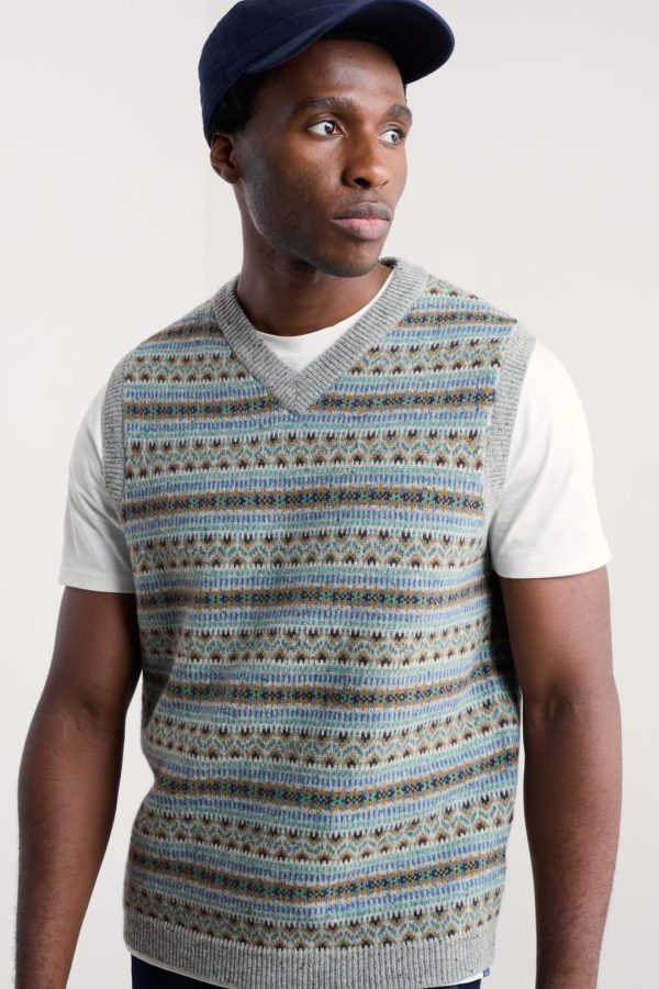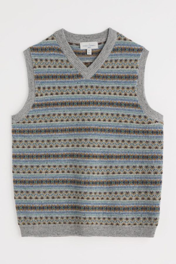 A transitional knit to layer through changing seasons. The v-neck Walt Vest has been crafted with a durable, wool-rich yarn made from responsibly sourced and recycled fibres. It has an easy fit and all-over Fair Isle stitch in a selection of colours picked from the Cornish landscape. Finished with neat ribbed hems, we love it layered over a tee or shirt.