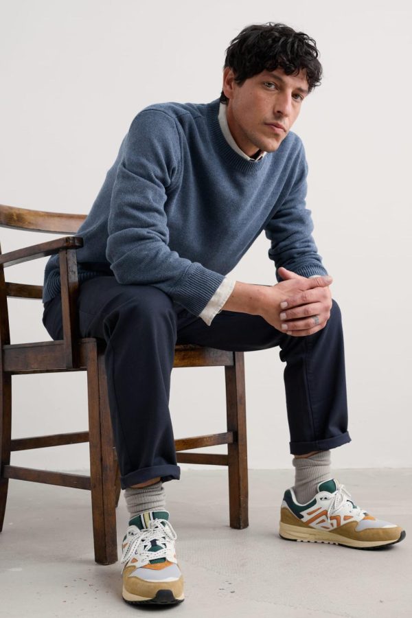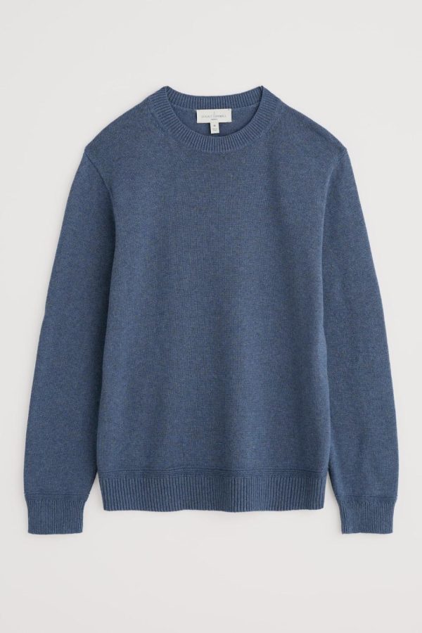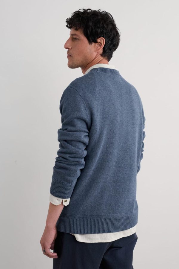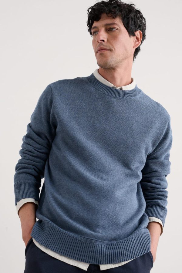 A timeless organic cotton jumper for light and breathable warmth. The all-over 7 gauge jersey stitch gives it a smooth, comfortable feel, while the ribbed cuffs and hem have a subtle racking detail just above for a little subtle structure.