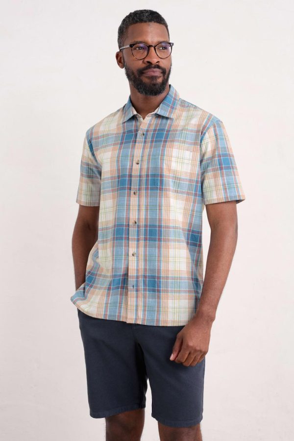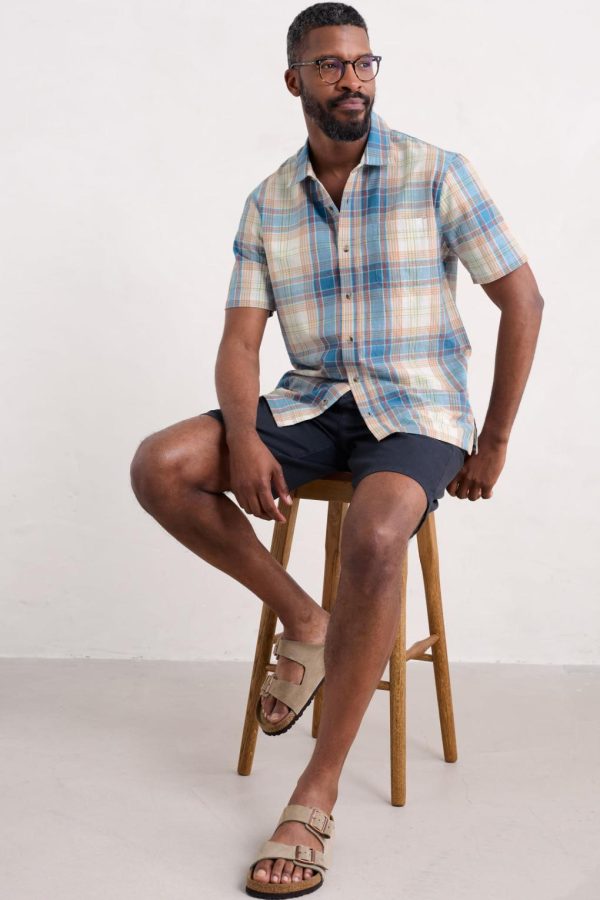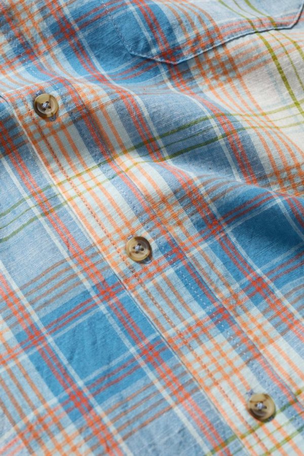 A short sleeve shirt with a tonal pattern in a breathable organic cotton blend. The easy fit and split hem make it great for layering, while a chest pocket adds a classic touch. Wear buttoned up or loose over a T-shirt.