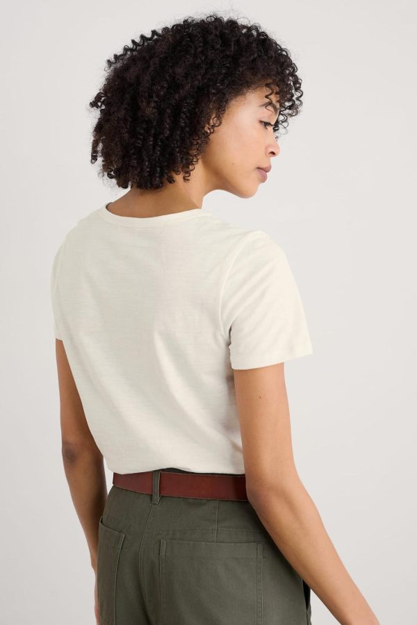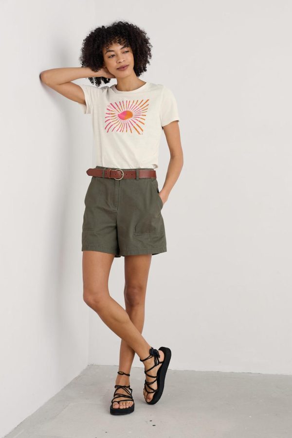 A graphic T-shirt inspired by our summer on the Isles of Scilly. This short-sleeved top is made from soft organic cotton with an abstract design depicting waves and the island sunshine. We love it with wide leg culottes, leather sandals and a rustic basket bag.