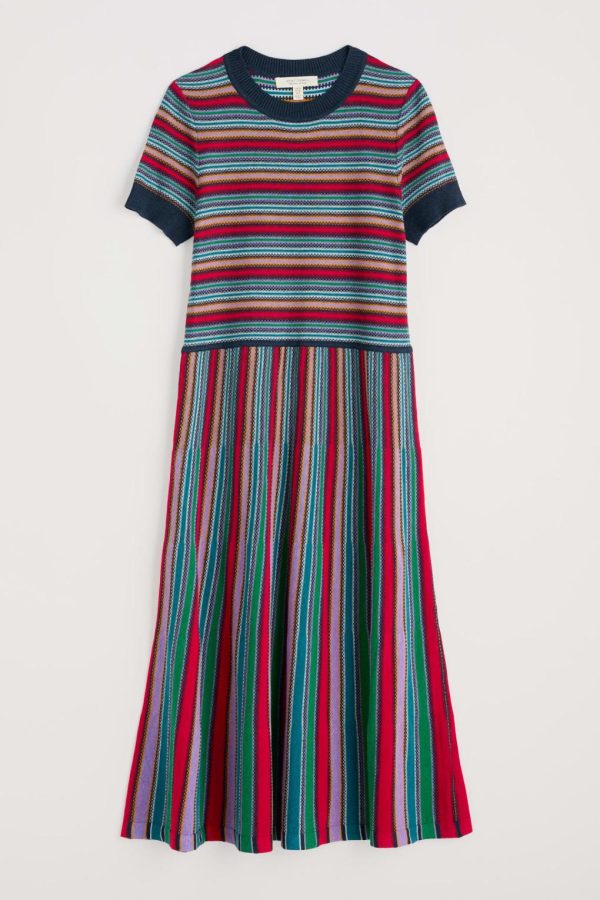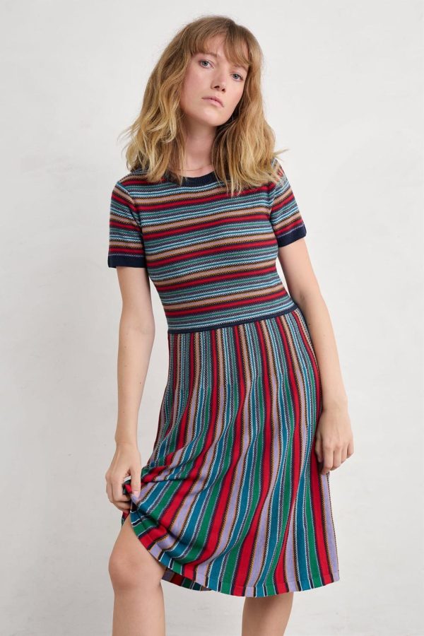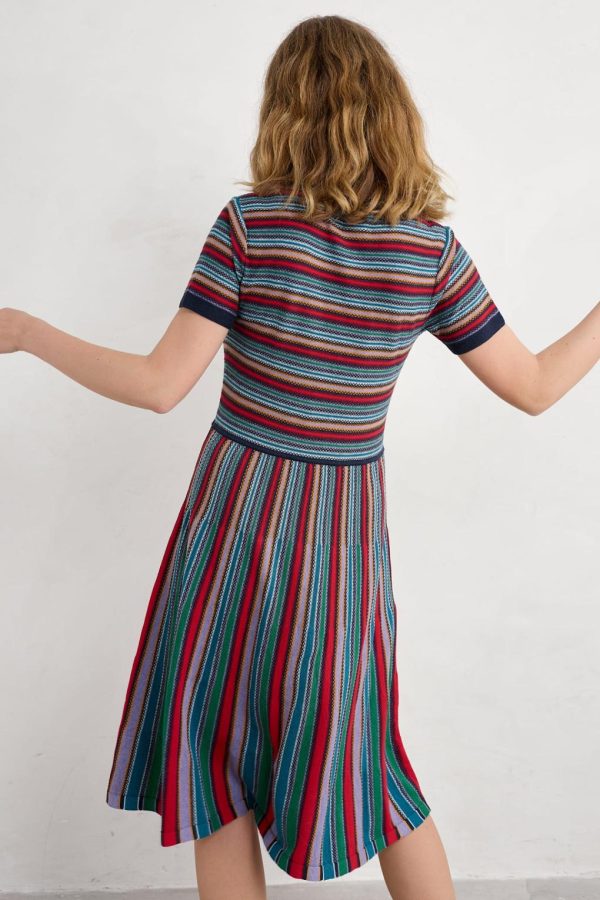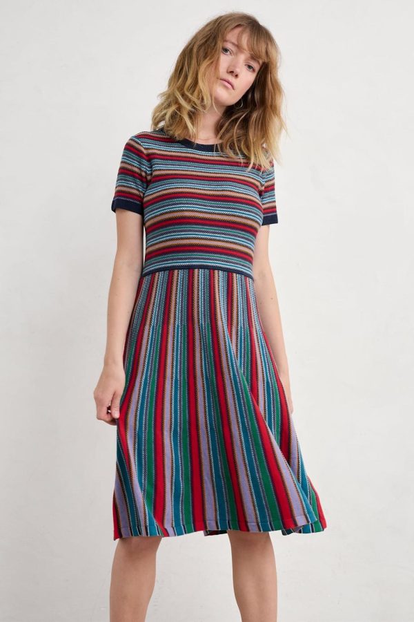 A lightweight fit-and-flare midi dress with colourful yarn-dyed stripes. It’s knitted from GOTS-certified organic cotton for cool and comfortable summertime wear. The textured stitching brings depth and character to the vivid coastal colours, while the contrasting stripe direction on the skirt creates a striking detail. We’ve kept the styling simple with a trimmed round neck and short sleeves, letting those beautiful stripes speak for themselves.