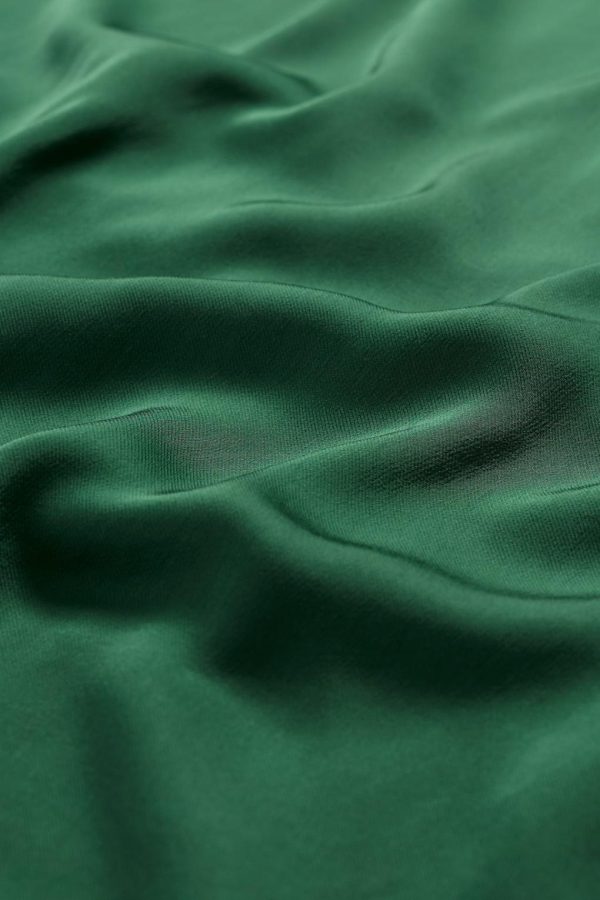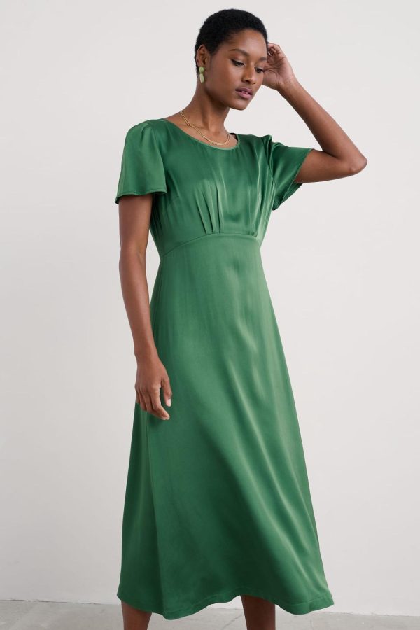 An empire line midi dress made from drapey satin. Its classic shape is emphasised by the curved waistband and darts at the bust and waist. Fluted short sleeves and a boat neckline help to keep the styling elegantly simple, while the keyhole and button at the back add a subtle extra detail.