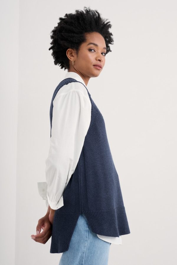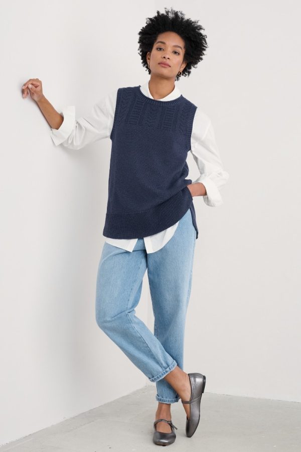 One of our longer knitted vests, made from breathable organic cotton with an easy shape and a split stepped hem that make it perfect for layering. The stitch patterning at the yoke is inspired by traditional Fisherman’s jumpers.