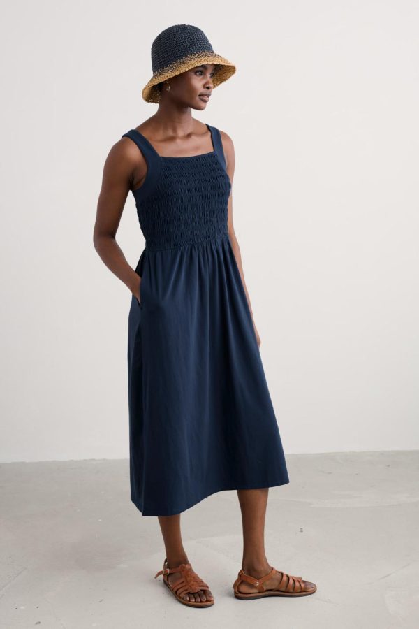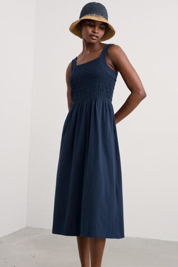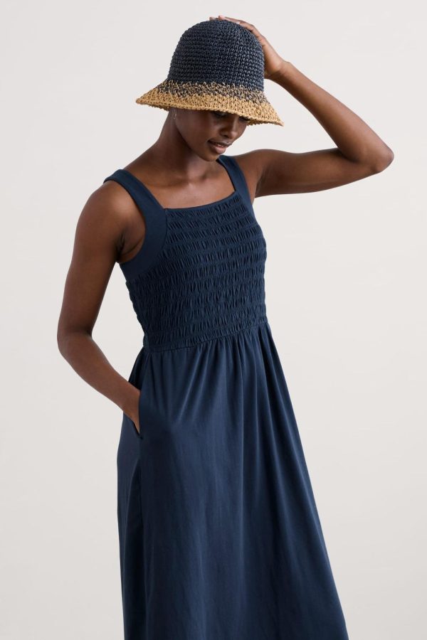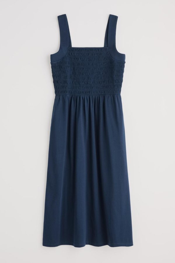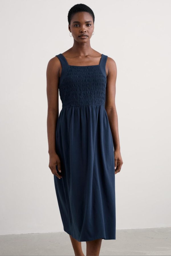 An easy-wearing midi sundress for summer days, made from soft organic cotton jersey. The bodice has vintage-style shirring all the way round for a flattering waisted shape. Wide straps give you a touch of support while creating a square neckline front and back. A pair of in-seam pockets adds the finishing touch.