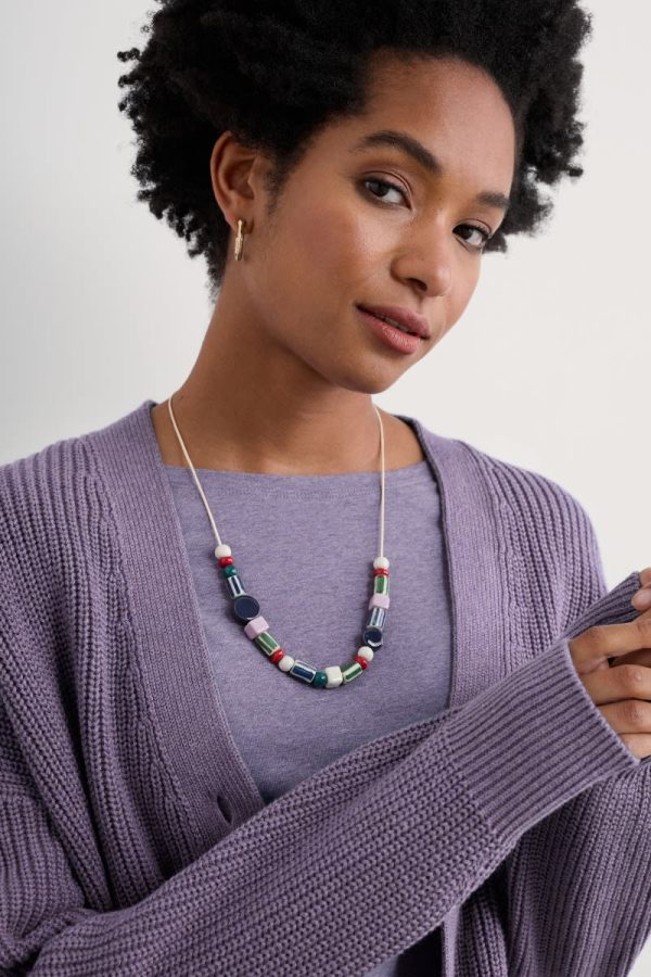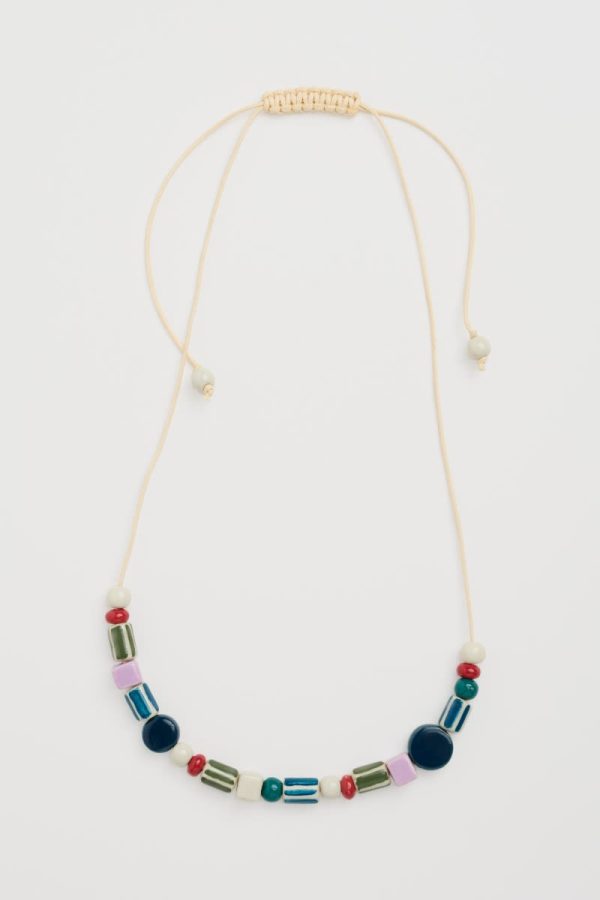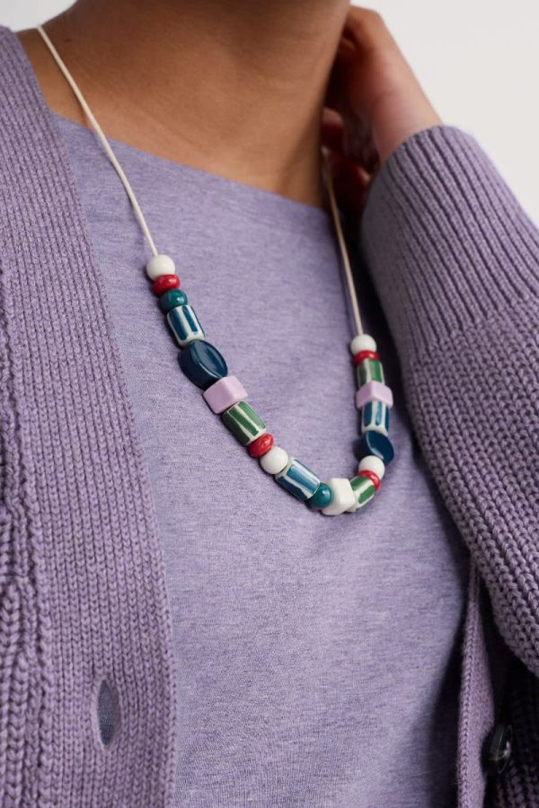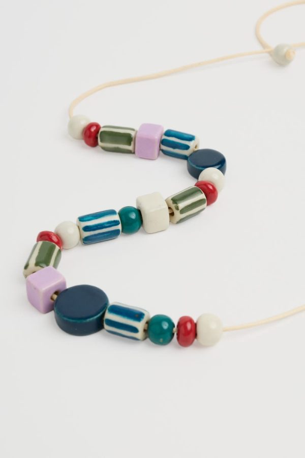 Colours, textures and stripey details blend joyfully in our Vervain Necklace. The ceramic beads come in contrasting colours, bringing together this season’s vibrant palette. They’re threaded onto a cotton cord that can be adjusted to 90cm, finished neatly at the back with a pair of dainty beads.