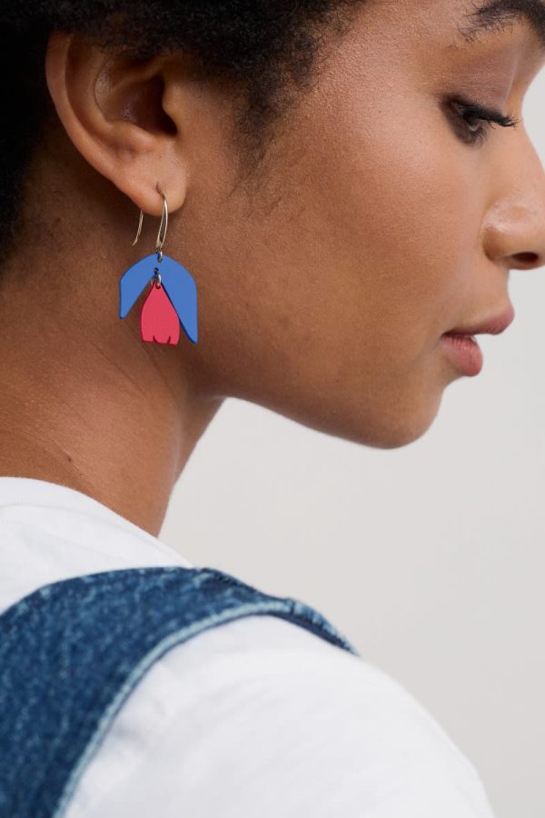 Bright and beautiful, these contemporary-style drop earrings are inspired by our own floral prints. The recycled brass is coated with smooth resin in eye-catching colours, complemented by the gleaming gold tones of the fastening. The petals are held together with rings, and sway gently when when you move.